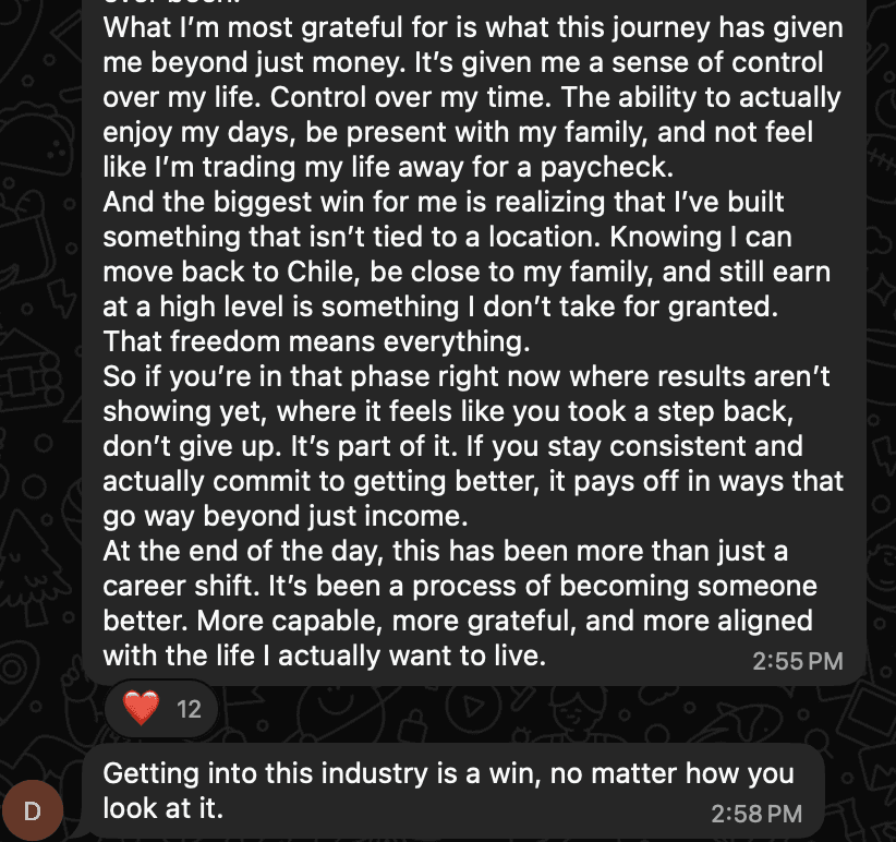 The testimonials and examples on this site are from real students and reflect their experiences. However, these results are not typical, and your results may vary. We do not guarantee any specific income or success. Your level of success depends on factors like your work ethic, background, experience, and dedication. Any income or earnings mentioned are estimates or past results and should not be considered average or guaranteed future outcomes.